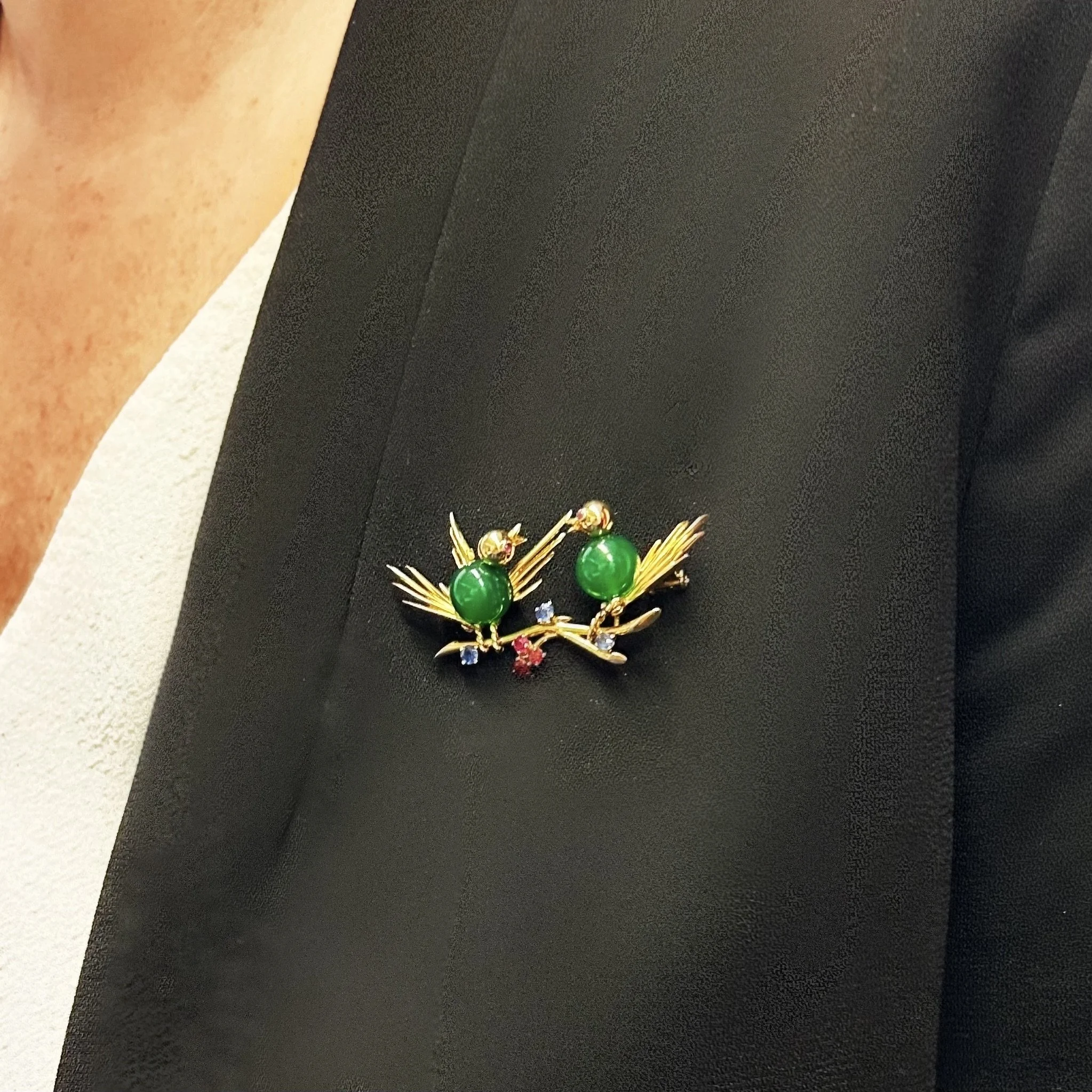 Chrysoprase, ruby, sapphire and gold bird couple brooch