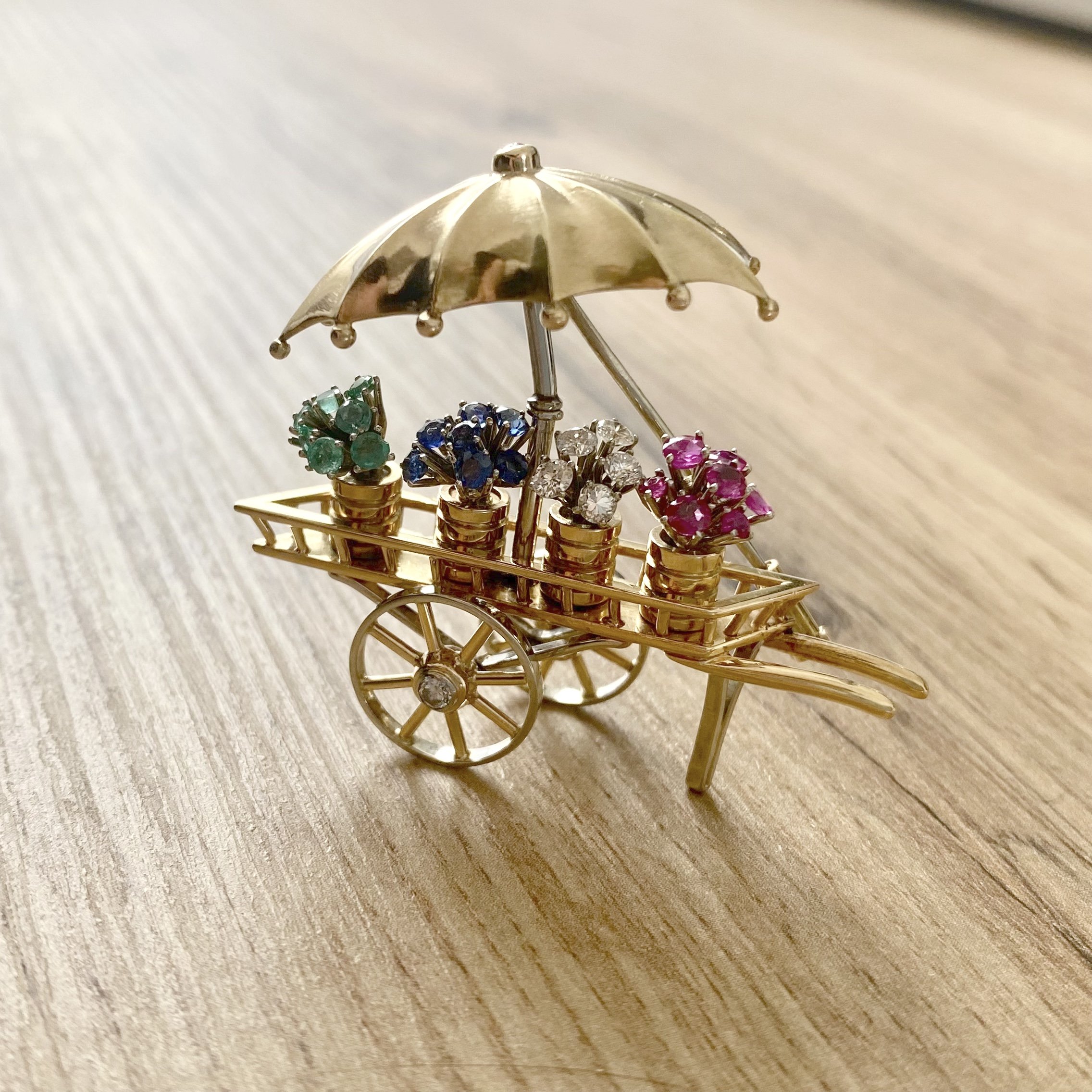 • 7 emeralds for approx. 0.15 ct total (1 slightly chipped), 7 sapphires for approx. 0.30 ct total, 7 rubies for approx. 0.35 ct total + 1 small ruby on the umbrella.