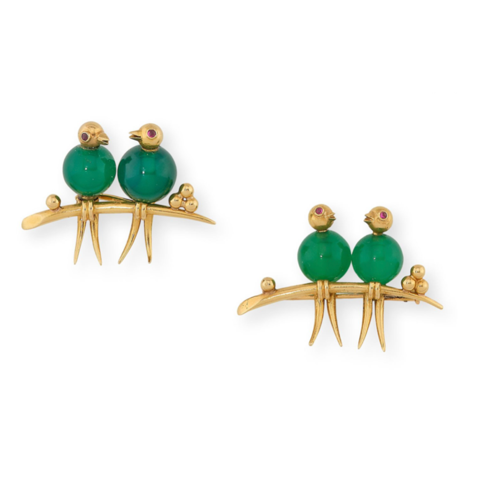 Pair of chrysoprase, ruby and gold bird couples brooches, by Mellerio