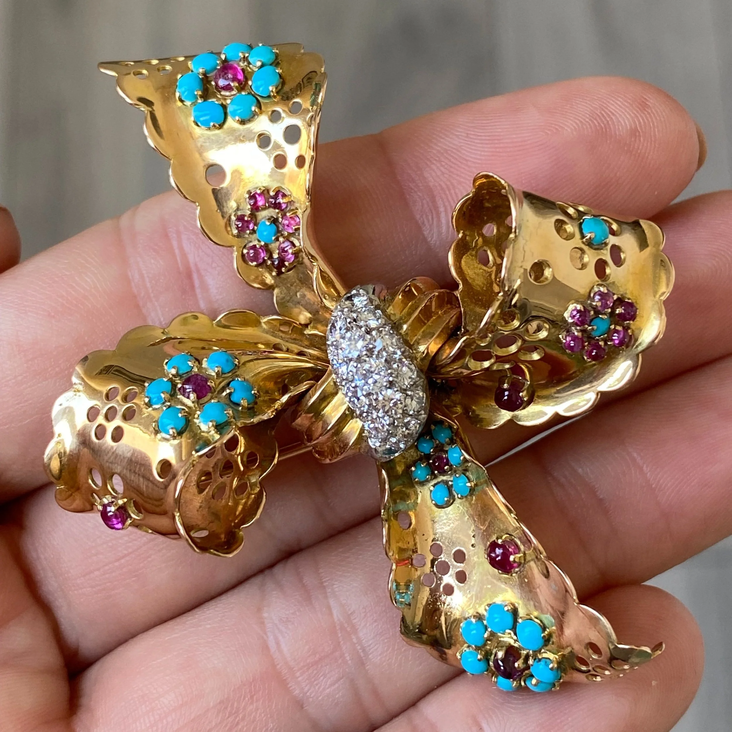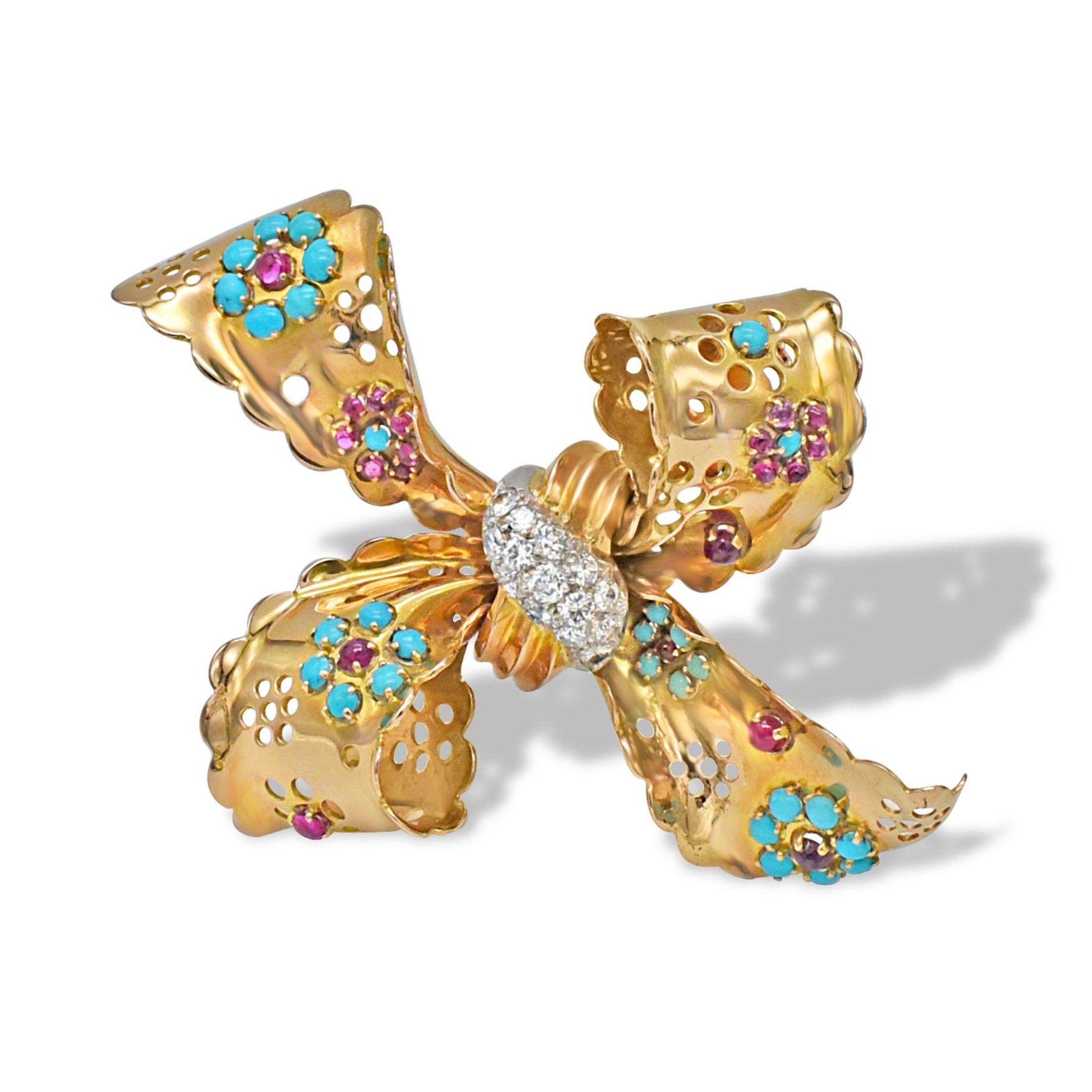 Retro gold, turquoise, ruby and diamond bow brooch, 1950s