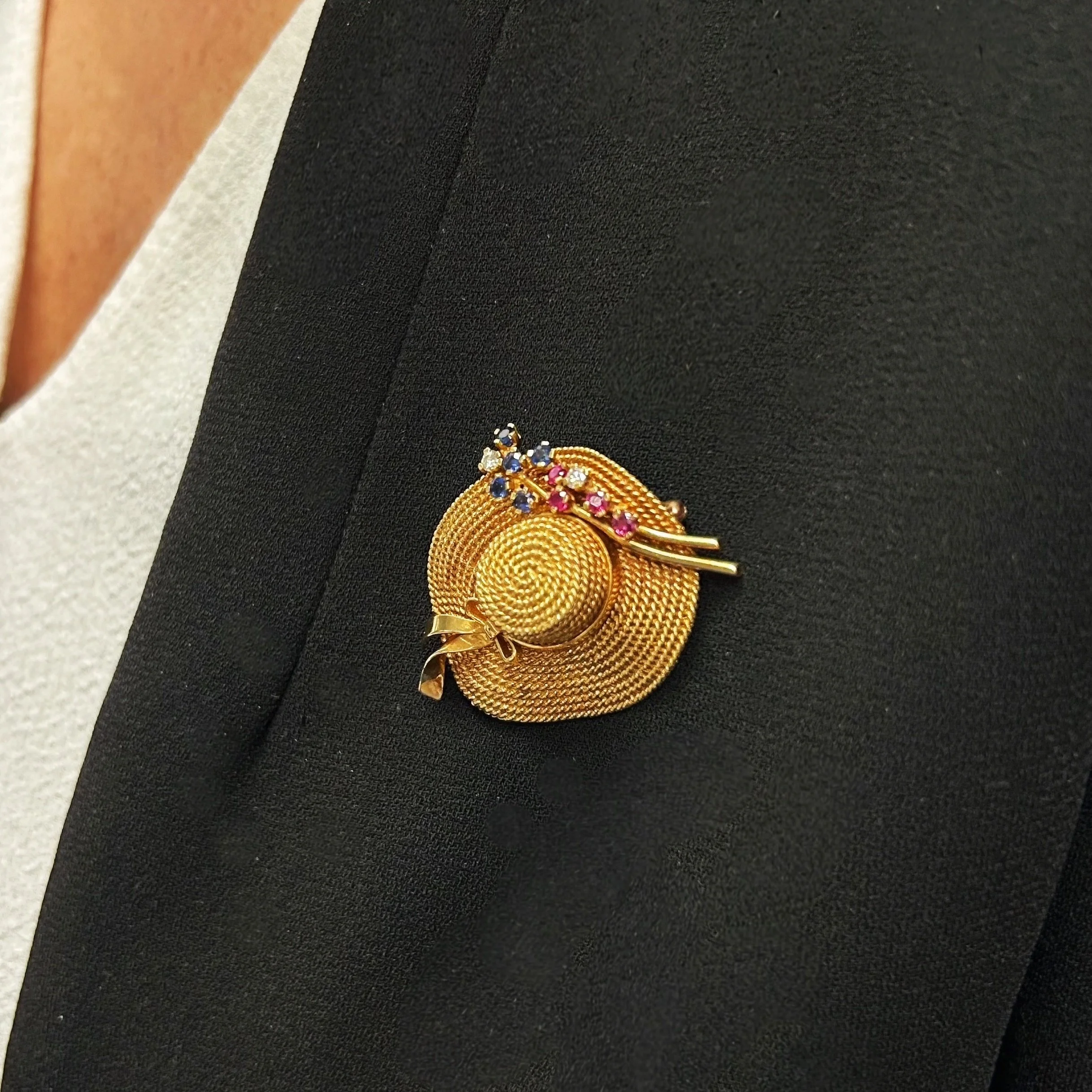 18k gold, sapphire, ruby and diamond straw hat brooch